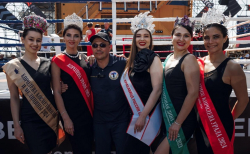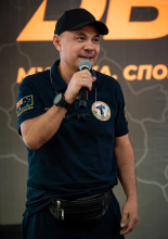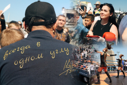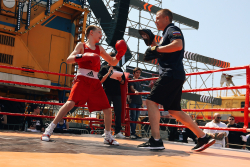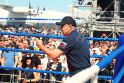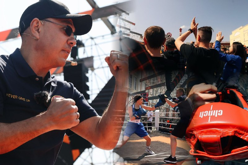 Знаменитый боксер заехал на площадку на байке. Поприветствовал гостей вместе с Сергеем Кочневым (президентом академии бокса Кости Цзю), после провел чемпионскую разминку.